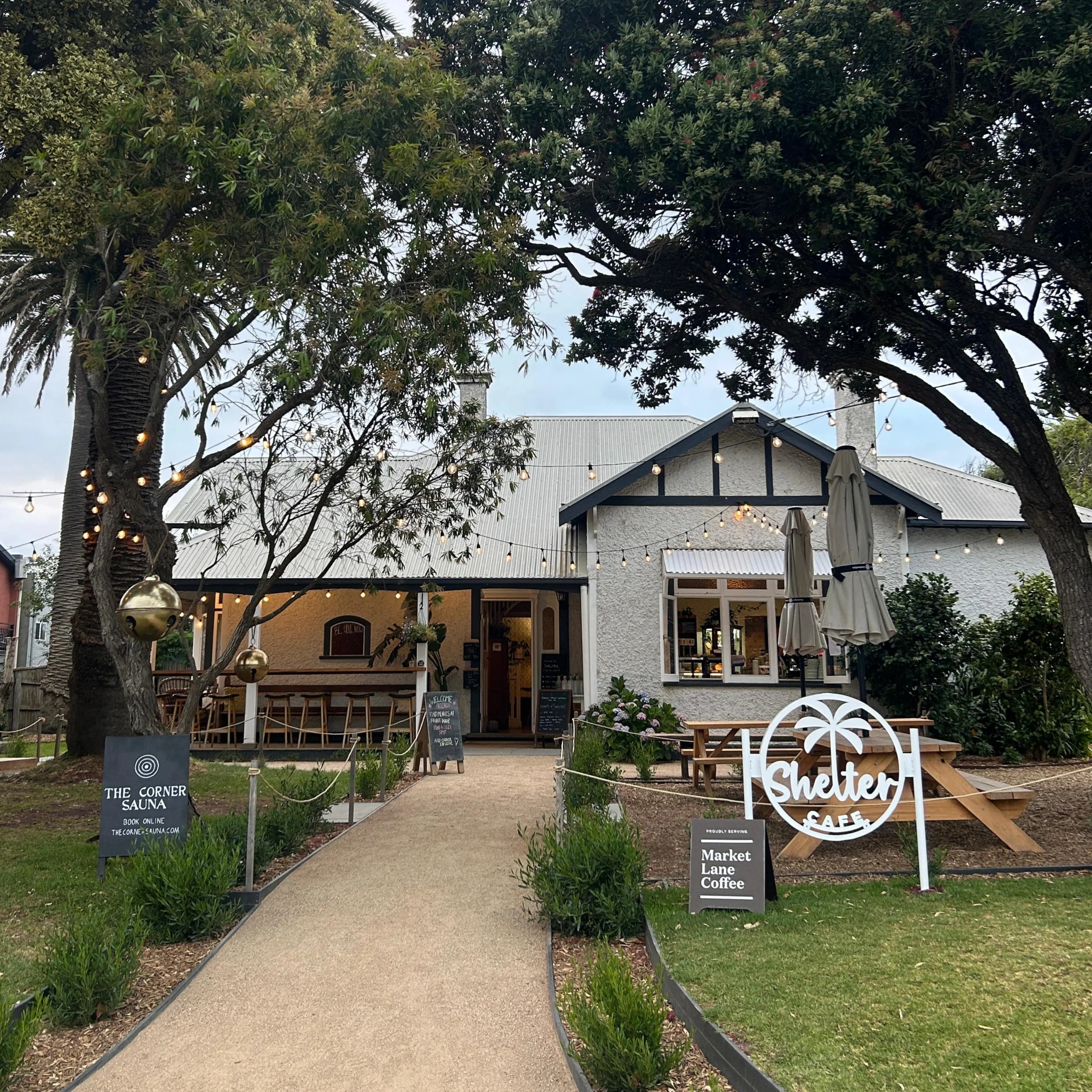 Inside, Shelter holds up to 32 people in a space that feels cosy, lived-in, and warmly lit, with antique charm woven into every corner. Outside, our backyard opens into a spacious garden framed by native trees and bountiful fruit trees, with picnic tables and shaded pockets perfect for rugs, laughter, and long afternoons.